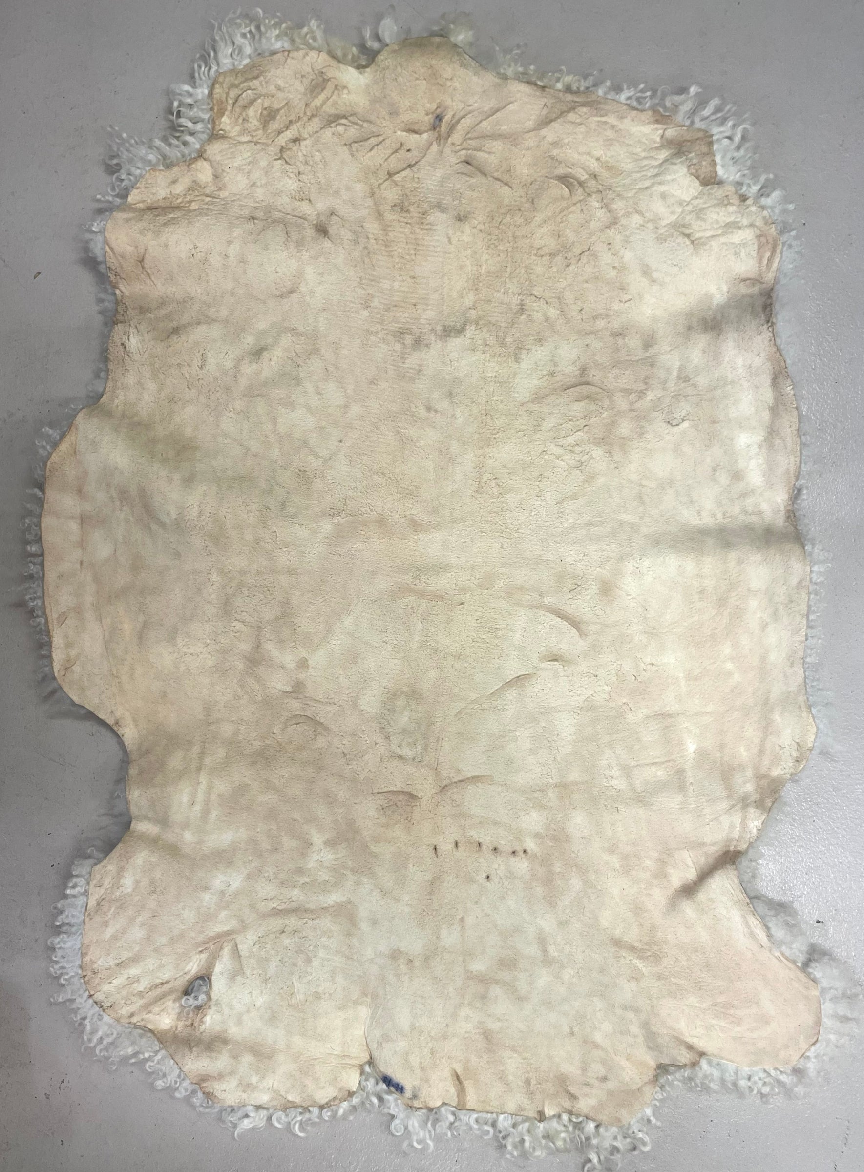 This beautiful sheepskin feature has well-defined curls in a warm cream color.  There is one small hole but it is not visible from the front (see photo.  Washable